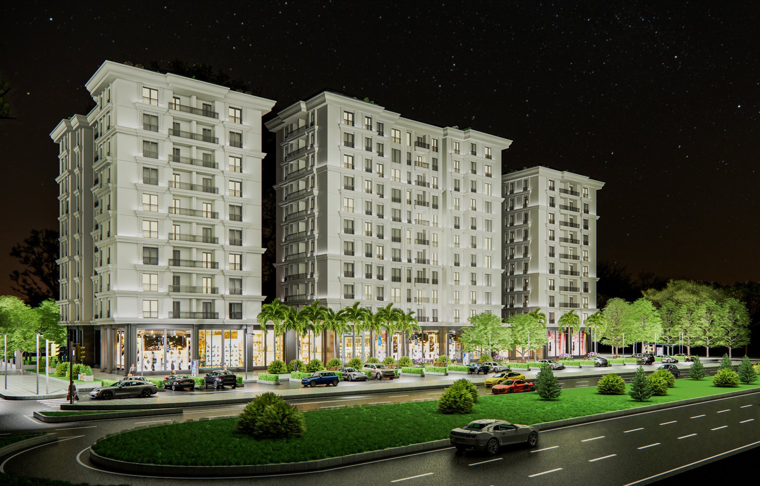 يتألف المجمع من 3 مبانٍ، يحتوي على 140 شقة موزعة على 5 شقق في كل طابق و 11 محل تجاري.